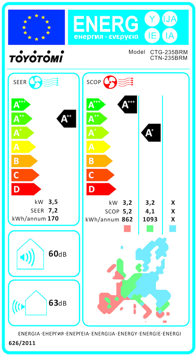 Το κλιματιστικό ανήκει στην ενεργειακή κλάση A++, στην ψύξη και στην ενεργειακή κλάση A+ στη θέρμανση (μέση ζώνη). Η ενεργειακή κλάση μετριέται σε μια χρωματική κλίμακα επτά βαθμίδων από Α+++ έως D, με την κλάση Α+++ να είναι η αποδοτικότερη, ενώ αντίθετα η κλάση D, η ελάχιστα αποδοτική.